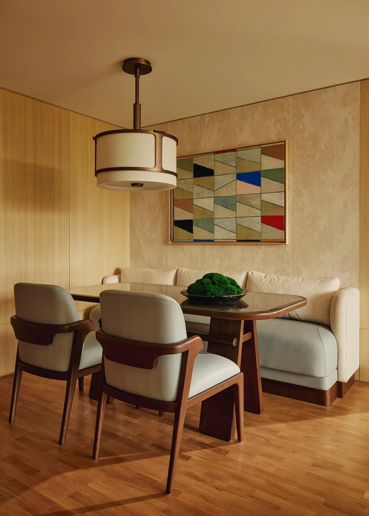 Elegant dining room with city views, a large wooden table, and modern wall art.
