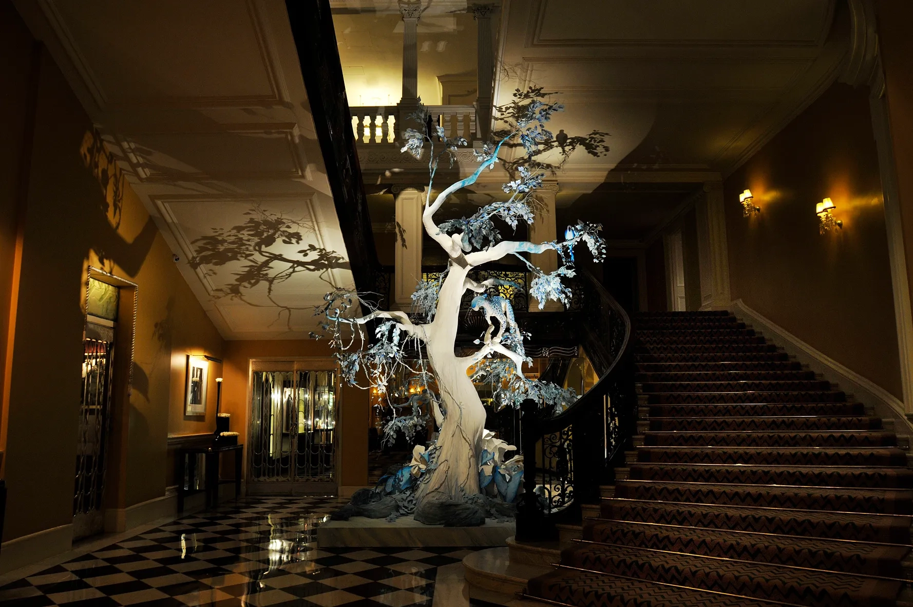 2009 marked the first time Claridge's Christmas Tree was to be designed by a famed fashion designer. The Christmas Tree by John Galliano for Dior evoked a frozen twist on tradition with a tropical tree completed with snow leopard, dragon flies and parrots, echoing Claridge's art deco surroundings.
