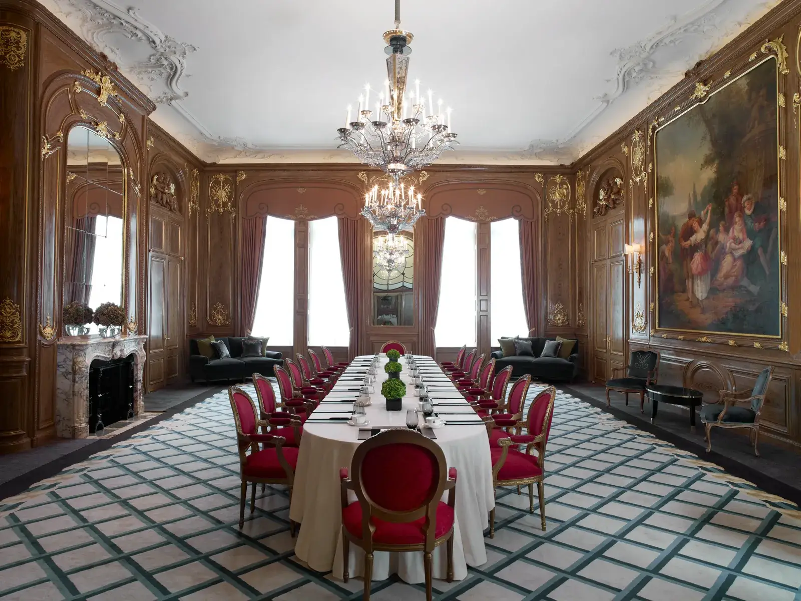 With exquisite original features, including Art Deco ironwork tassels by Basil Ionides and winged Renaissance-style cherubs, the French Salon offers an elegant setting for business or social events. A striking mural of a dancing couple, uncovered when the room was last refurbished, adds to its charm. For larger gatherings, it seamlessly connects to the Drawing Room, creating a truly sophisticated venue.