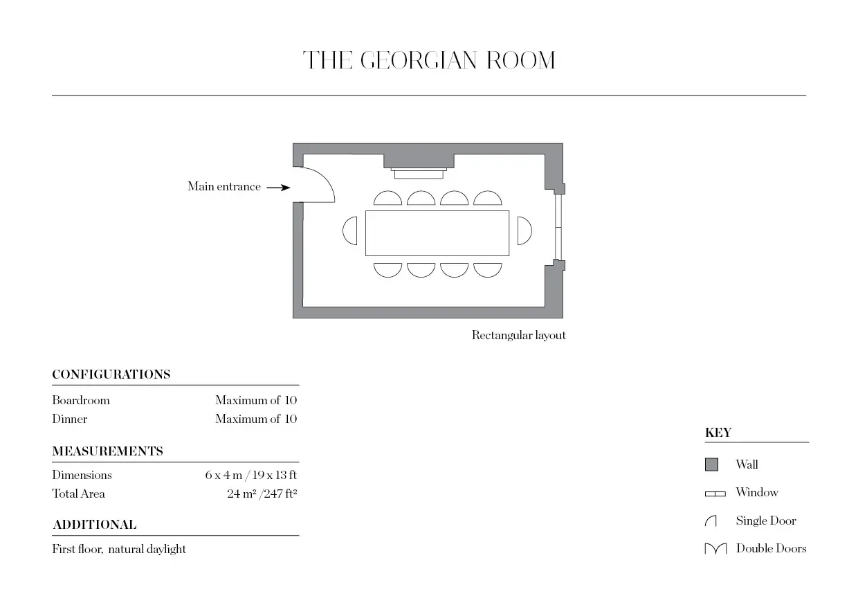 The Georgian Room offers a sophisticated and intimate setting, perfect for business meetings and small board meetings, refined business dinners, private presentations, elegant dining celebrations, and peaceful lunches.