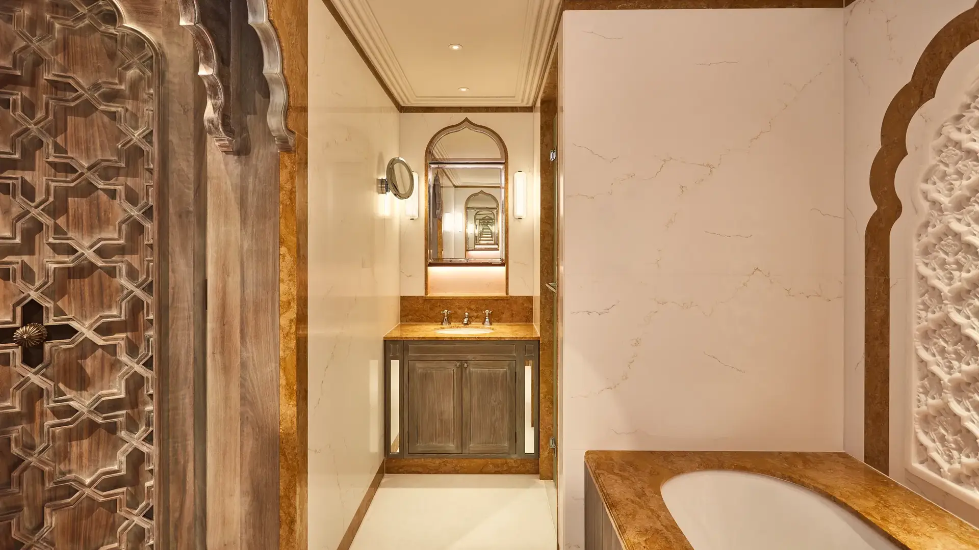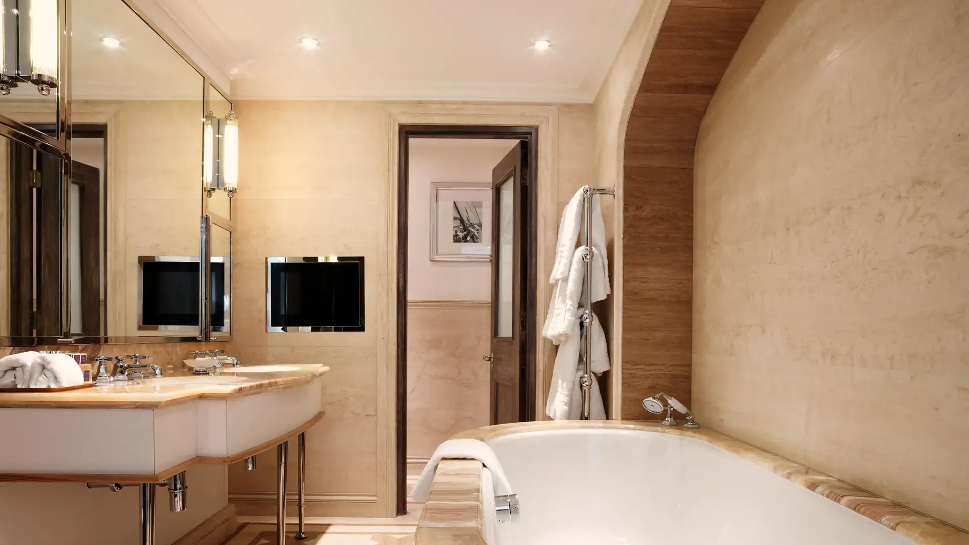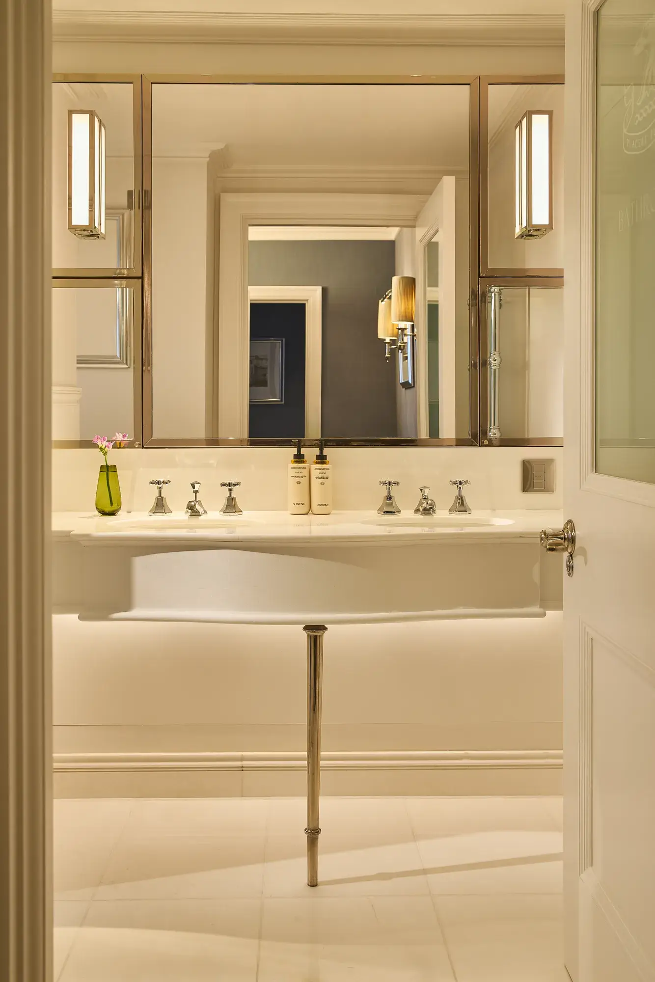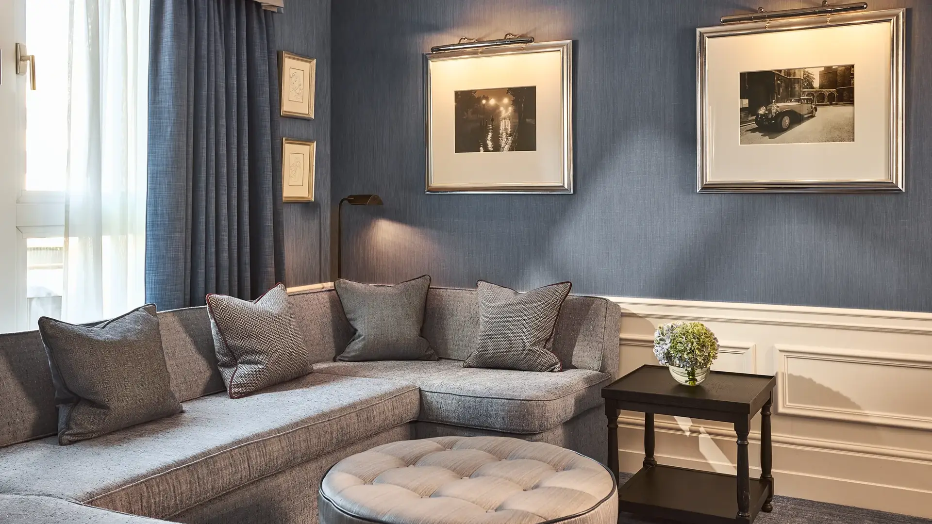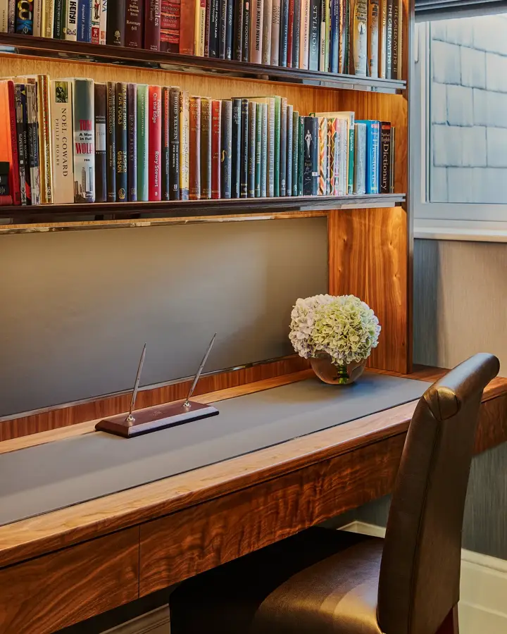 A tribute to The Connaught’s storied literary heritage, The Writer’s Lodge is a sanctuary of quiet sophistication and creative spirit. Inspired by the celebrated authors who once found refuge within these walls, the suite is anchored by a bespoke writer’s desk in a thoughtfully appointed study. Polished silver frames showcasing evocative post-war high-society photography lend a sense of timeless charm and narrative.