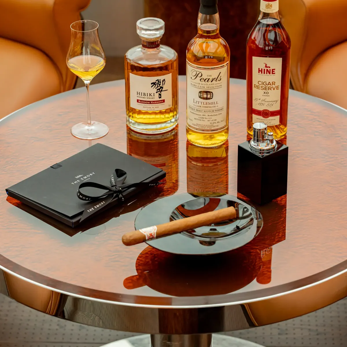 Enjoy a bespoke cigar and spirit pairing, expertly selected by our Head of Cigars at The Emory Cigar Merchants. This refined experience invites you to savour the perfect harmony between premium hand-rolled cigars and exceptional spirits, selected to complement and enhance each other in a setting desinged for true connoisseurs.