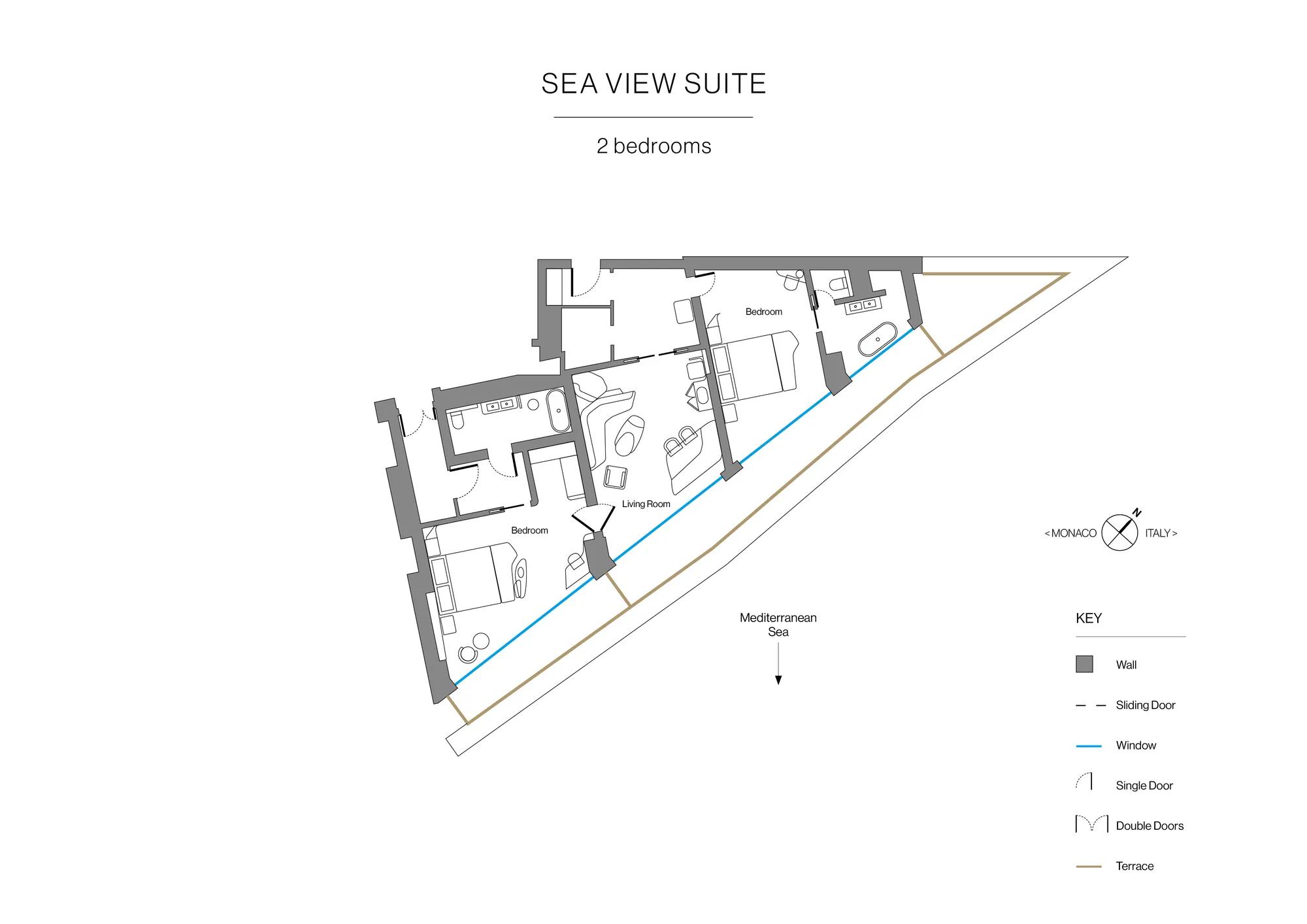 The considered simplicity and refined elegance of the Sea View Suites are inspired by the fluid, calming nature of the sea, with natural materials and soft colours gently mirroring the alluring beauty of the surrounding landscape. Floor-to-ceiling windows fill the space with golden light, framing the spectacular panoramic views of the Riviera coastline. As the sun begins to fade over the Côte d'Azur, linger on your private terrace and gaze out to the horizon.